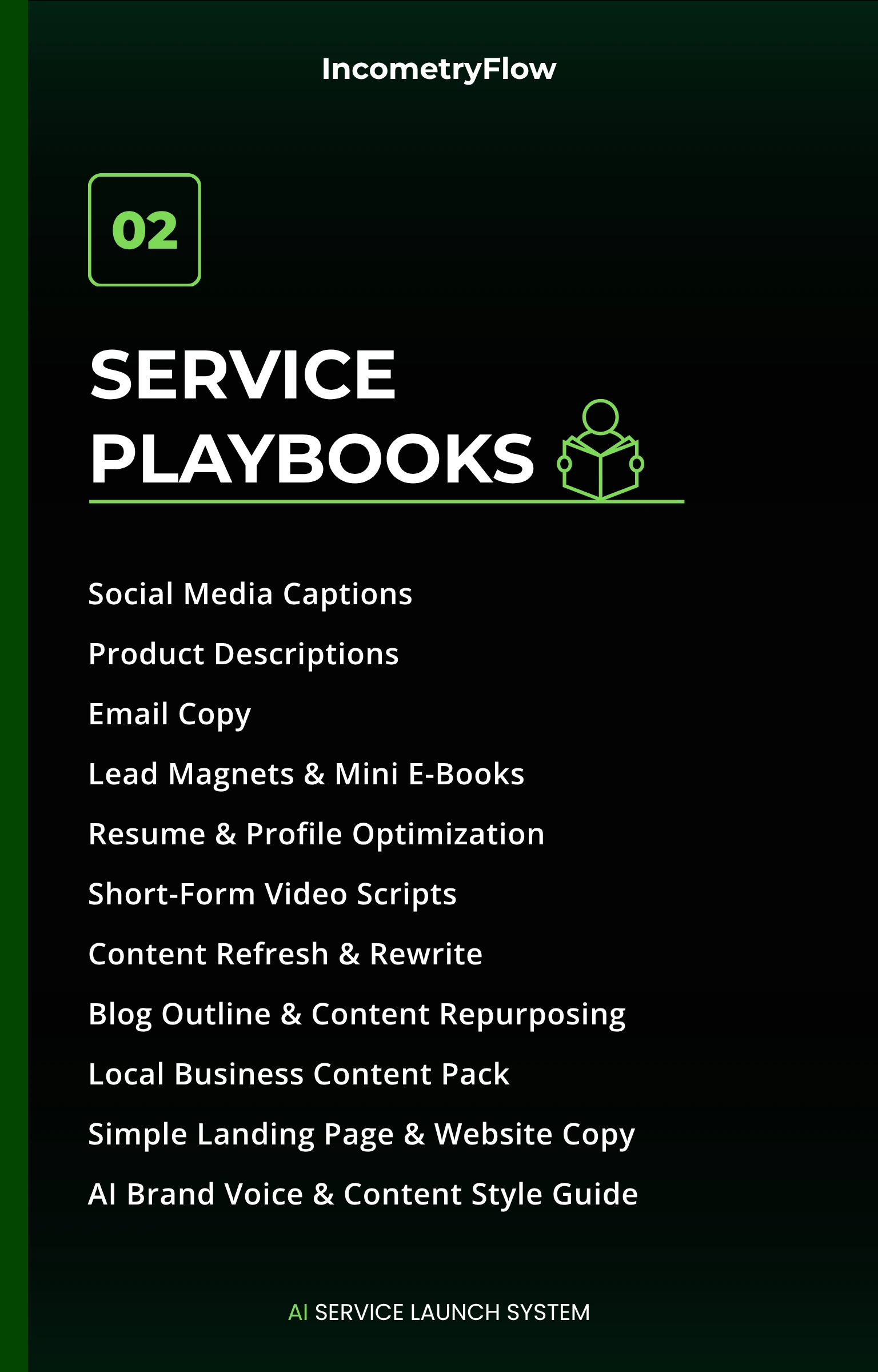 Each playbook covers what to offer, who buys it, how to package it, what to ask the client, and how to deliver.